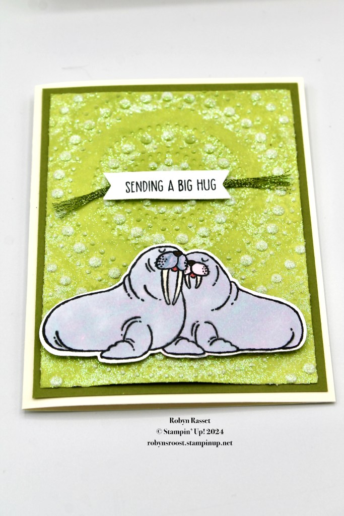 The second card uses the Hearts & Hugs Bundle another new set from the 2024-2025 Annual Catalog. This card uses Very Vanilla Thick (also retiring), Old Olive and Lemon Lime Twist card stocks. The greeting label is die cut with a die from the Hearts & Hugs Dies but it was shortened by cutting it twice. The walruses are colored with Stampin’ Blend Markers. I intended to color one pink and the other blue, but goofed and started coloring the boy walrus pink so colored them both with Bubble Bath and then colored over it again with Balmy Blue. I liked the resulting color! Sometimes mistakes turn out.