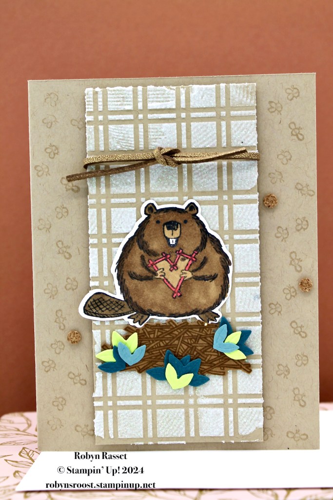 A greeting could easily be added under the beaver house. The Fluffiest Friends stamp set is images only so another greeting set would be needed. I decided to leave this card without greetings so that I can use it for any occasion.