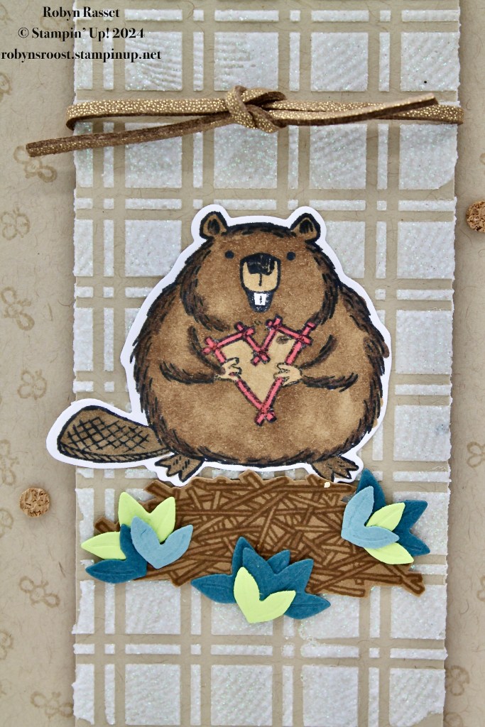 The beaver is stamped with Tuxedo Black ink and colored in with a variety of the Natural Stampin’ Blends. I used a Light Poppy Parade for the ‘heart’ sticks so that they would pop out a bit more. The little bees on the card front don’t quite go with the beaver but maybe they can be flies for this instance, lol. I added some Cork Rounds and the Gold Faux Leather Trim to add to the outdoorsy, nature look.