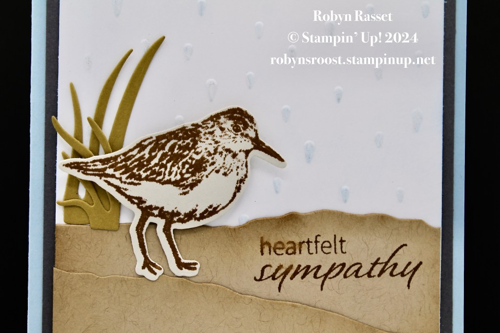 The bird is stamped on a new paper color, Beige (watch for it in the new Annual Catalog), with Pecan Pie ink and then die cut with the Seaside Bay Dies. Two clumps of grass were also cut with the dies, from Wild Wheat paper. There are two dimensionals behind the bird’s body and his feet were adhered with liquid glue.