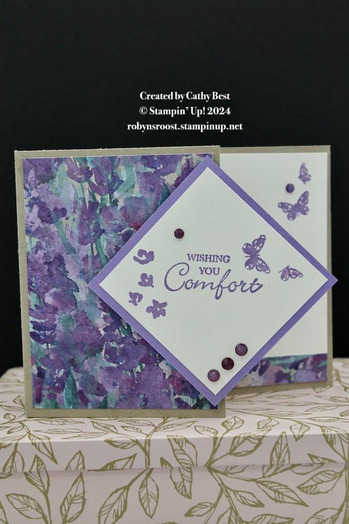 Cathy’s card is another fun fold. The card has 2 1/4″ sliced off of the top fold card base, with a 2 3/4″ square adhered to the front for the greeting. Five of the pretty Purple Fine Shimmer Gems decorate the card. I love the positioning of the gems. The Hope You Know and Painted Lavender stamp sets were used.