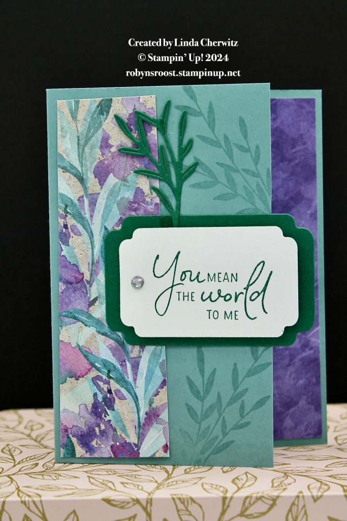 Next we have a card created by another Linda. This card has 1″ strip cut off of the card front for an overhang look. The greeting is from the Perennial Postage stamp set on labels created with the Something Fancy Die set. The leaves are created with the Painted Lavender Bundle. A single Rhinestone adds some sparkle.