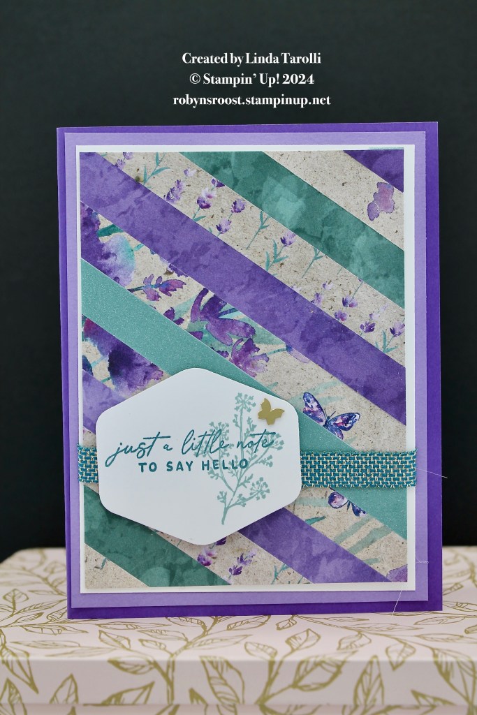 Linda’s card showcases a great way to use all those scrap strips of beautiful designer series paper. She has make a pretty background by alternating the solid backsides of the DSP and the pretty floral fronts. The greeting is from the Notes of Nature stamp set and is done on a label that created with the Hexagon Punch. A single Brushed Brass Butterfly decorates the label.