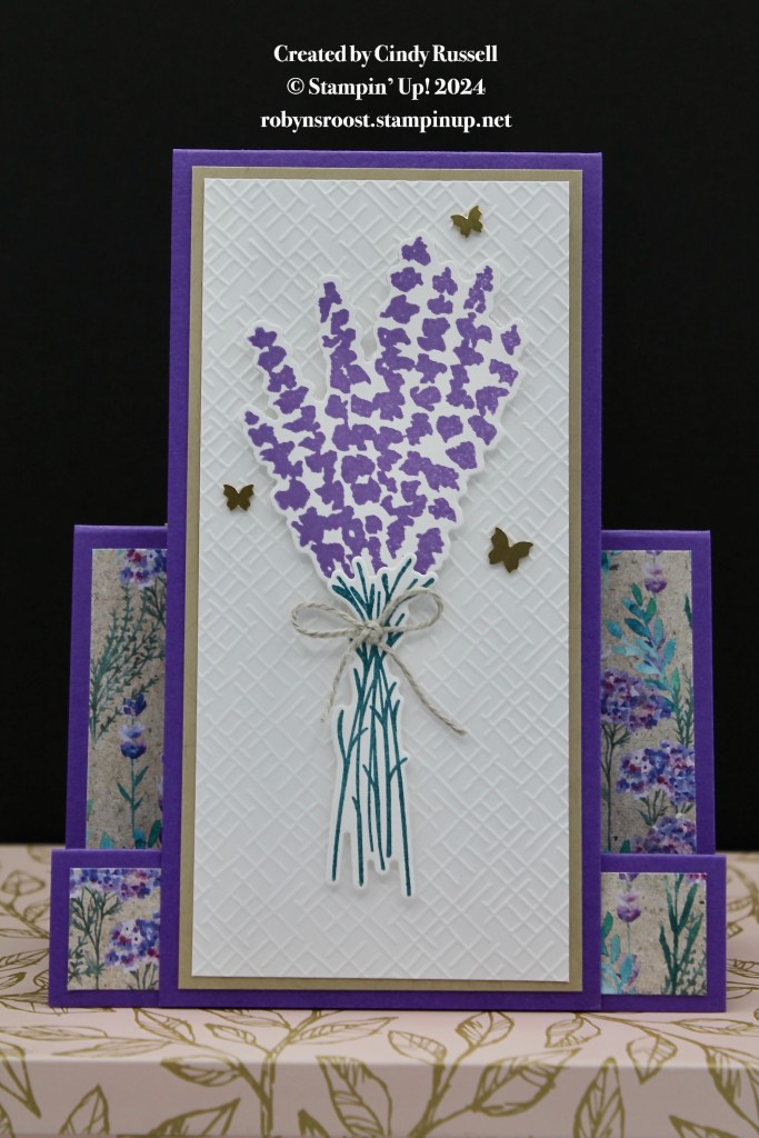 This card by Cindy Russel is a Easy Step Card as well as the beautiful Perennial Lavender Designer Series Paper this card uses the Painted Lavender Bundle and one of the Basic 3D Embossing Folders.