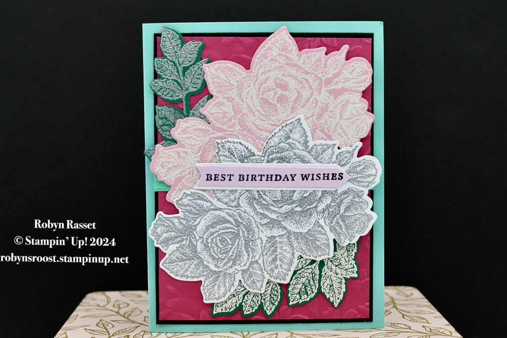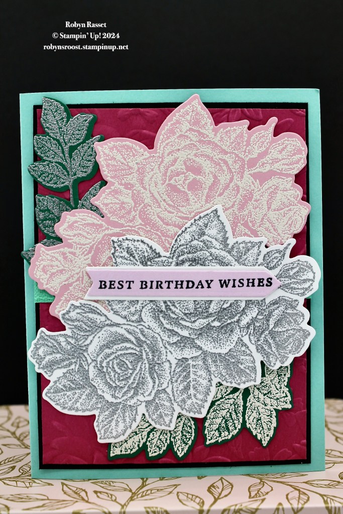 The pink rose in the back has been embossed with White Embossing Powder as has the green leaf sprig at the bottom. The The white rose and top leaf sprig have been embossed with Silver Embossing Powder. The dark pink background layer is embossed with the Layering Floral 3D Embossing Folder. A strip of ribbon in Shy Shamrock (new In-Color) was added behind the flowers but I’m afraid that it was almost lost in the process, lol. The greeting, from the Stippled Roses stamp set, is placed on a die cut from the Adventurous Sky (another new item) and a second die cut was created in white and then sliced in half long ways and layered under the greeting .