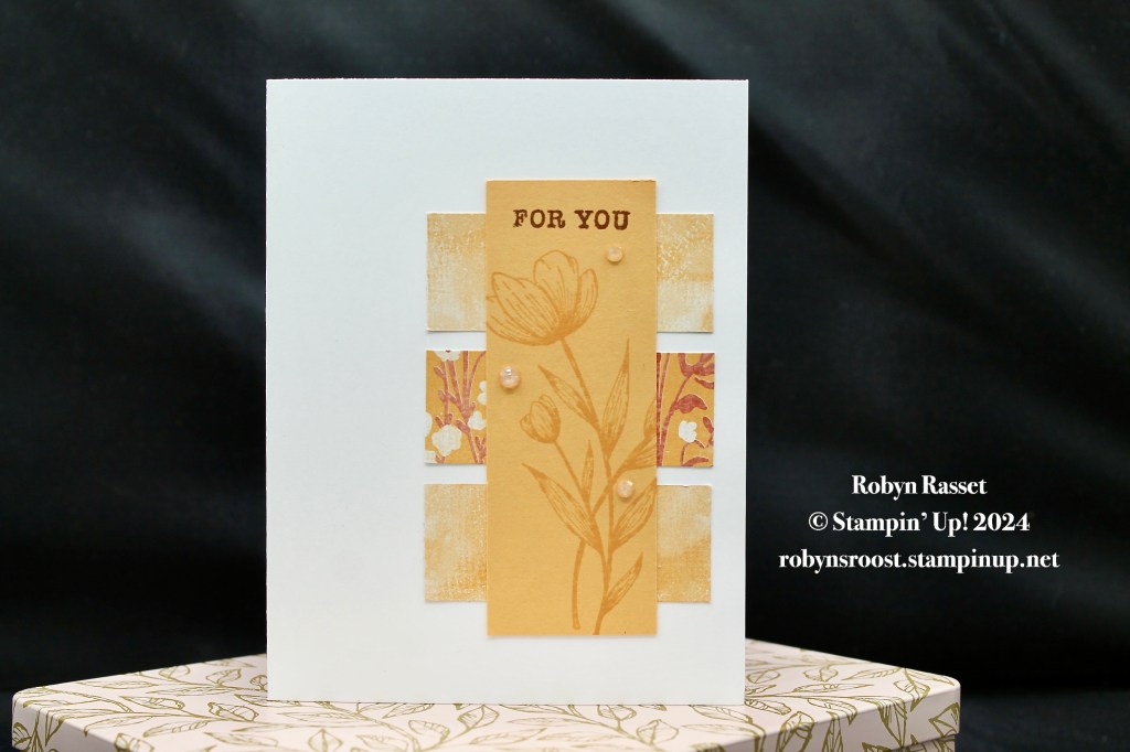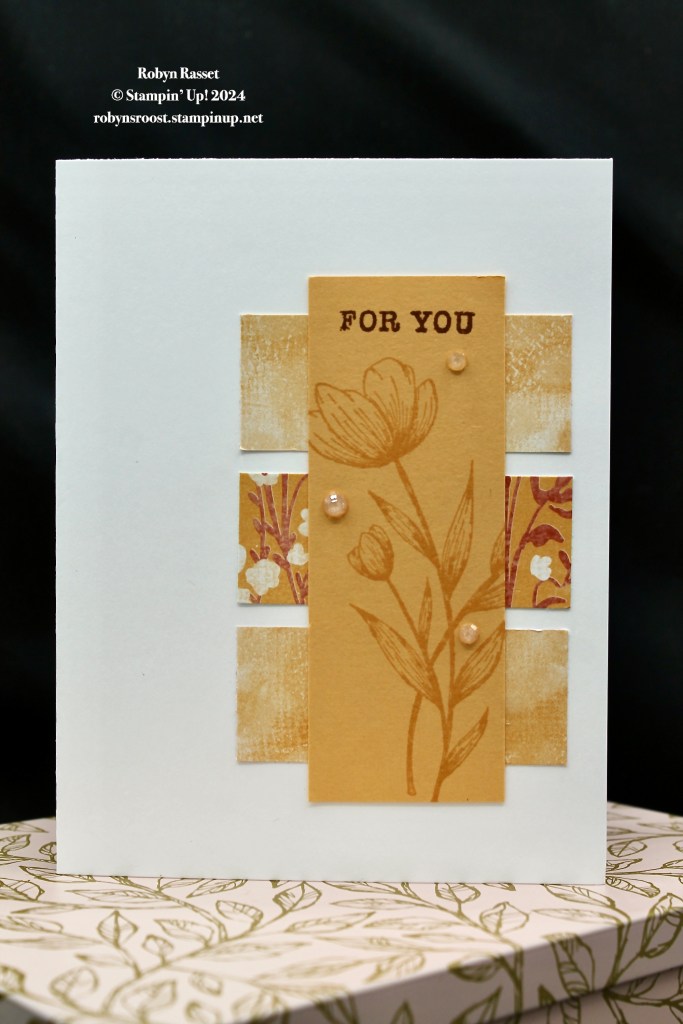 The card starts with a simple Thick Basic White base that has a side fold. Three 1″ x 2 1/2″ strips of the Unbounded Beauty designer series paper in Peach Pie colors were place behind the stamped image which is on a 1 1/2″ x 4″ piece of the Peach Pie cardstock. The flower from the Spotlight on Nature stamp set is inked with Peach Pie ink, while the greeting from the Keeping Tabs stamp set is done with Copper Clay ink.
