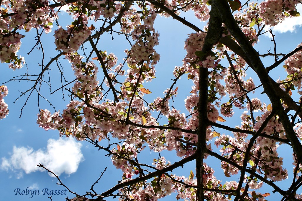 Zen, the older one, on the big rock, wanted to lay on the ground under the flowering crab tree. I and grandpa even got down under the tree! It was so pretty looking up at the clouds through the flowers.