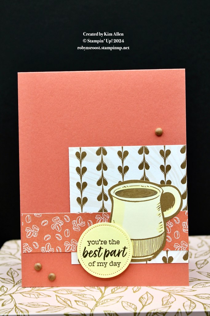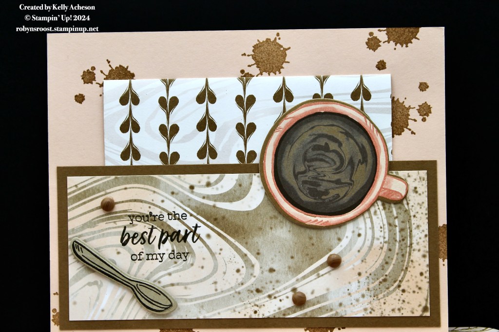 Kelly’s card starts with a Petal Pink base which has been stamped with Pecan Pie splotches. The coffee cup on this card is a die cut from the A Little Latte Designer Series Paper. The spoon is also die cut, but is stamped first from Crumb Cake paper. Like Kim, Kelly also used three of the Swirl Dots to complete her card.