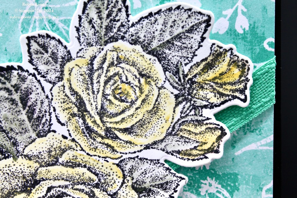 The large rose from the Stippled Roses set was stamped on Basic White with Tuxedo Black ink. The soft color was added by scrapping the Soft Pastels with an open scissor onto a clear block and then picking up the crumbles of color with a Water Painter. Because I used regular cardstock, I did need to be very careful to use only a small amount of water. After coloring it was die cut and adhered to the card using dimensionals.