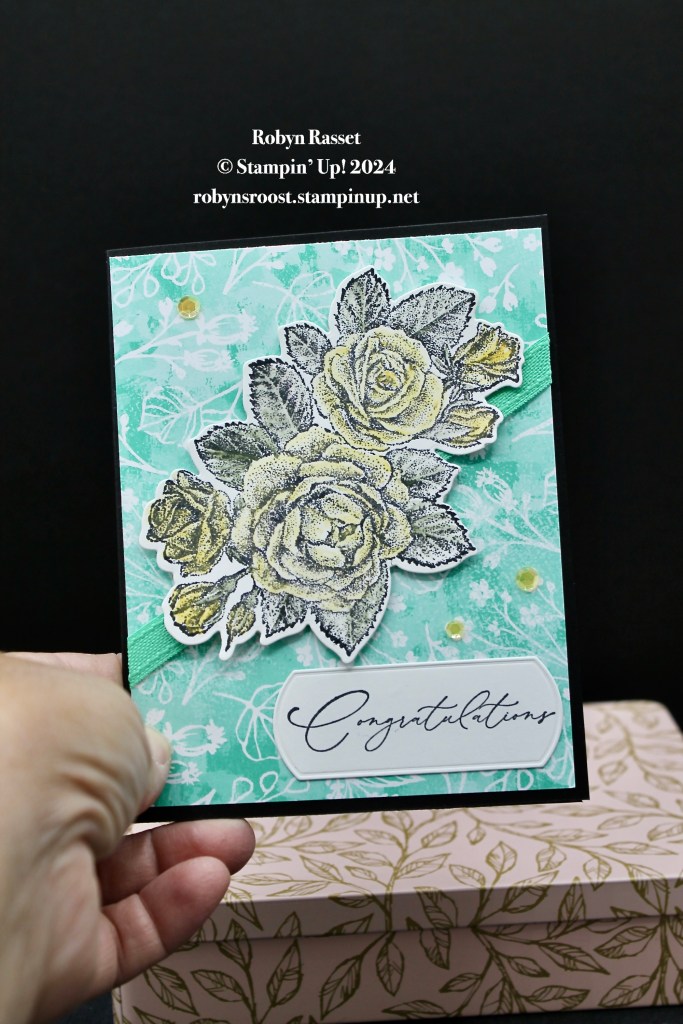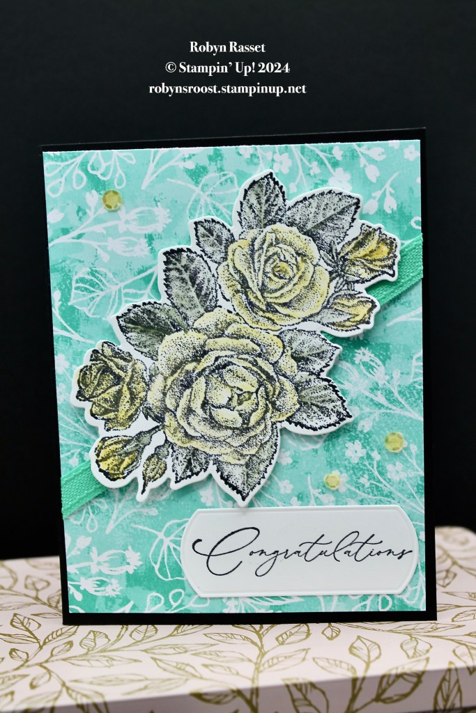 The card starts with a Basic Black base that is 8 1/2″ x 5 1/2″ scored at 4 1/4″. A 4″ x 5 1/4″ piece of the Unbounded Beauty Designer Series paper was adhered to the base after first adding a strip of the Shy Shamrock ribbon diagonally.