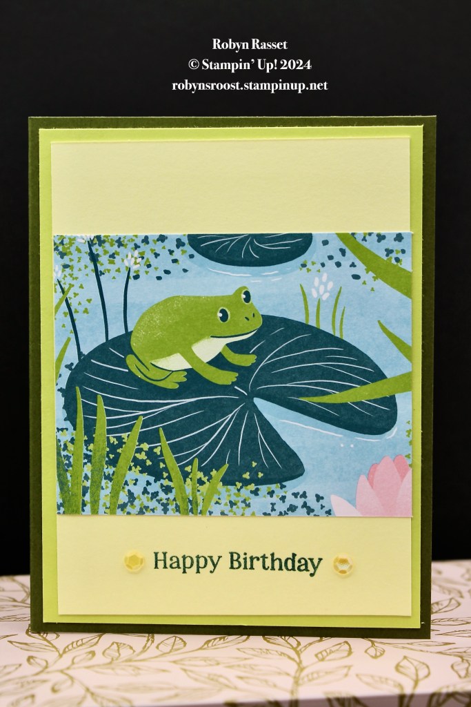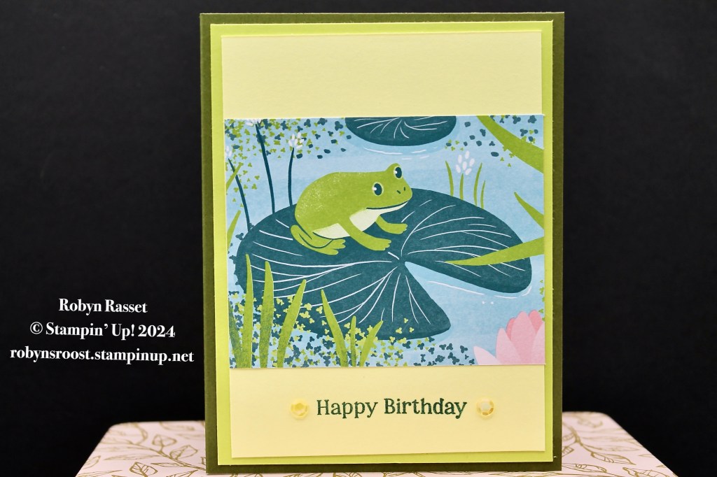 This cute card only takes minutes to create! The star of the show is the Lily Pond Lane Designer Series Paper. This cute frog is just one of the 12 designs in this card pack. One side is covered with ducks, lily pads and wetland scenery. The other side has all purpose designs.