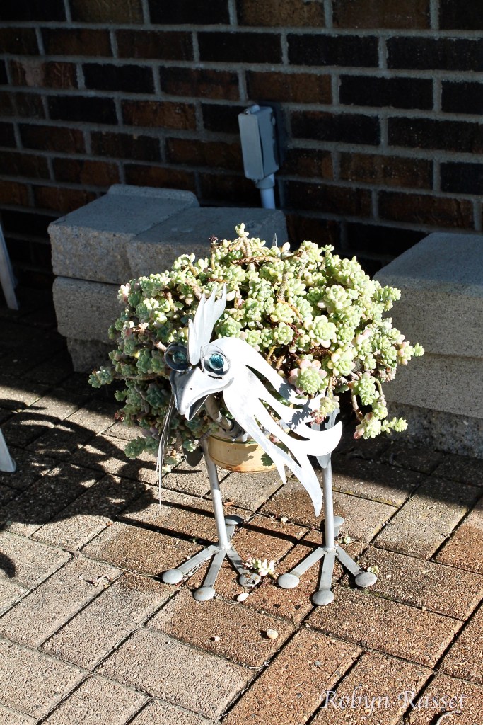 My son bought me this silly rooster pot holder years ago. I had to paint him a could of years ago, and he’s showing his age but still holding my Burro’s Tail plant and welcoming visitors.
