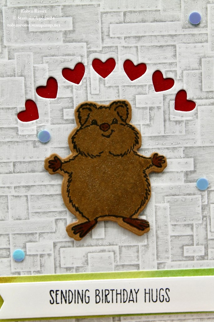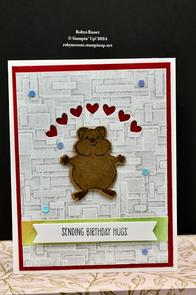 Today’s card was created for one of my grandson’s who shares my love of critters. The stamp set used is the Hearts & Hugs set which has four cute critters, the hamster, a mouse, walruses, and badgers.