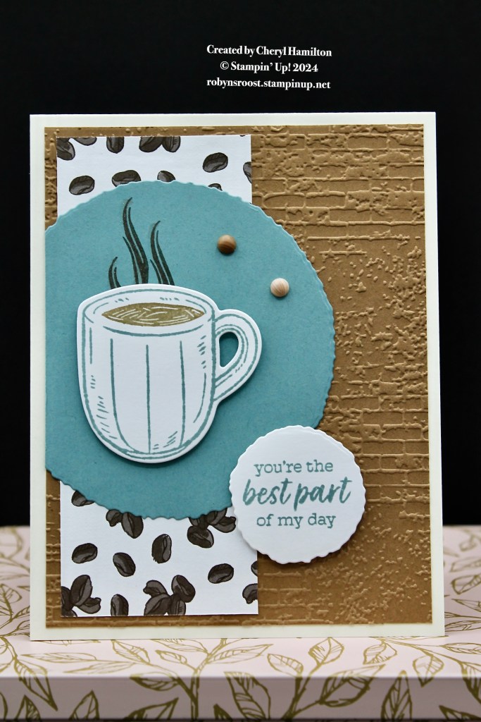 I love the way that Cheryl Hamilton ran the Deckled Circle off the edge of the card. with the strip of coffee beans and textured background this is a great card.