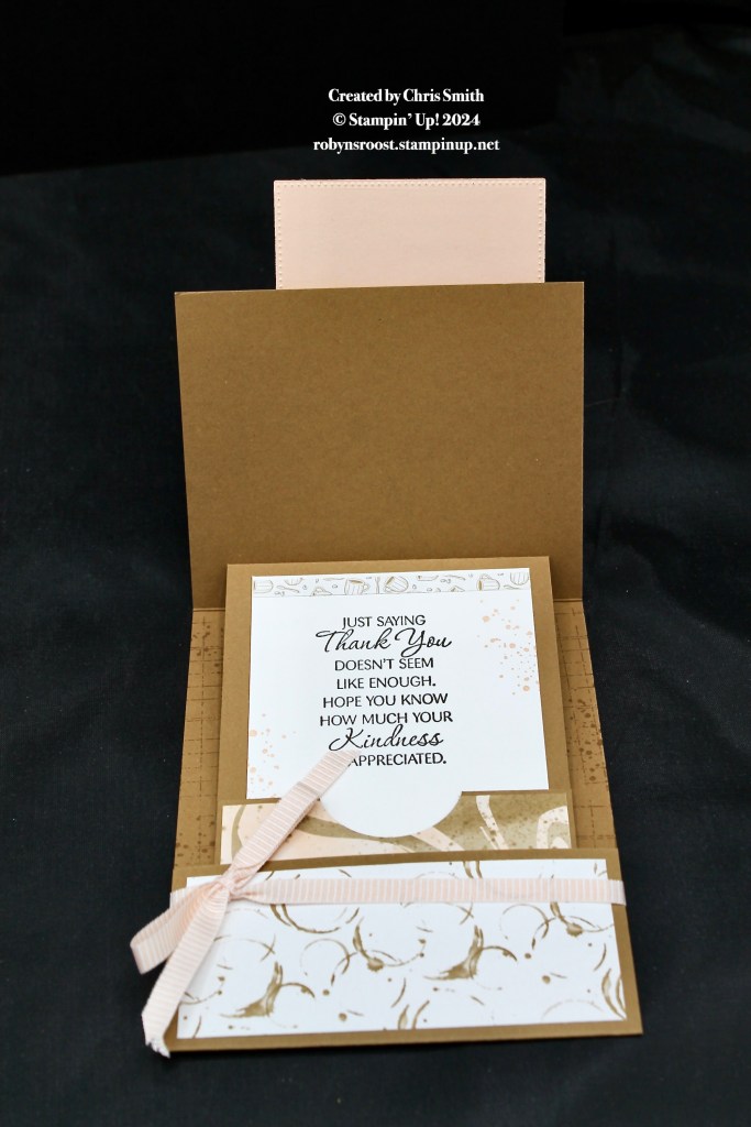 If you’re looking for a unique fun fold this card showcases one. Judy Klock used a Petal Pink base with the Little Bit of Latte DSP, a really soft and pretty color combo. I have no idea what the name of this cool fold is, but I did make one a while ago with the Trusty Tools Bundle and shared the directions on a post.