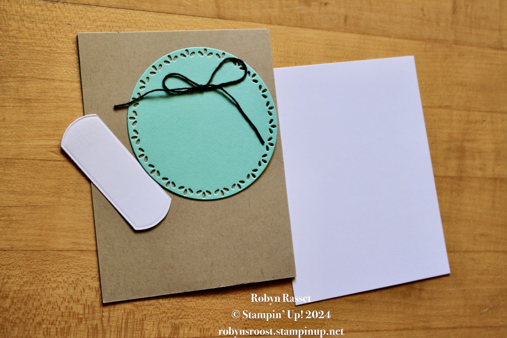 The greeting is from the Beach Day stamp set and is stamped on a label from the Unbounded Love Die set stamped with Early Espresso ink. It is also popped up. The pretty Coastal Cabana Circle from Kelly was die cut with the Spotlight On Nature Dies.