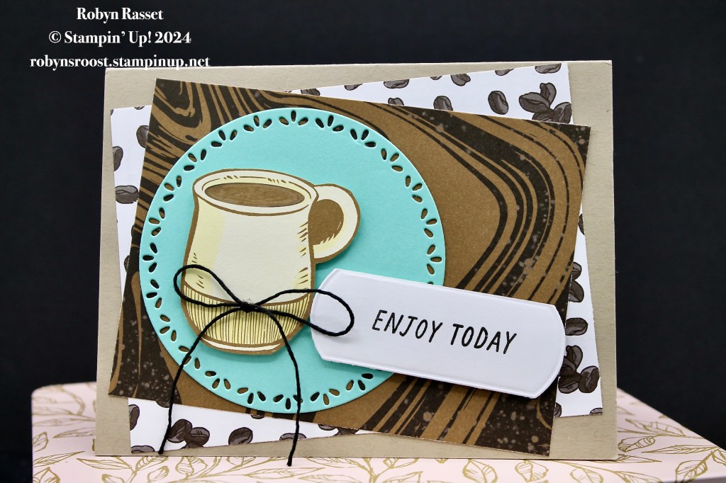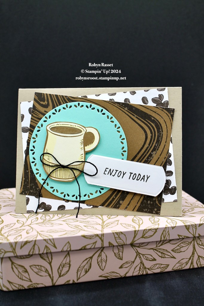 The designer series paper layers are 3 3/4″ x 5″ and 3 1/2″ x 4 3/4″. The coffee cup is fussy cut from one of the A Little Latte Designer Series Paper patterns and is popped up with dimensionals.