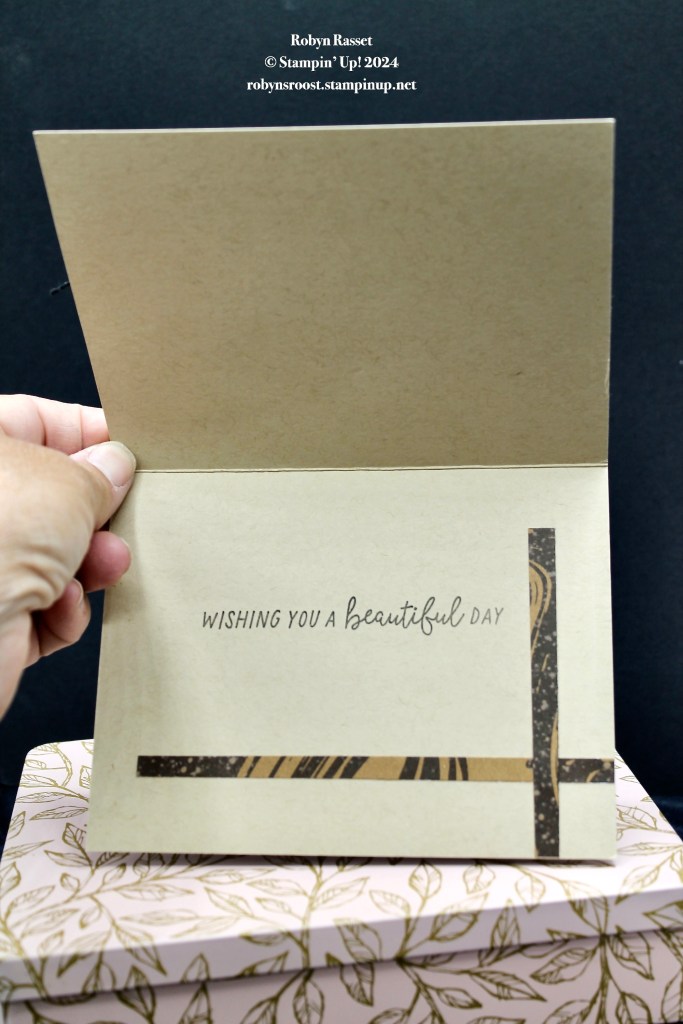 The inside has two scrap strips of the A Little Latte DSP with a greeting from the Beach Day stamp set done in Early Espresso.