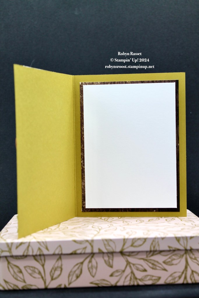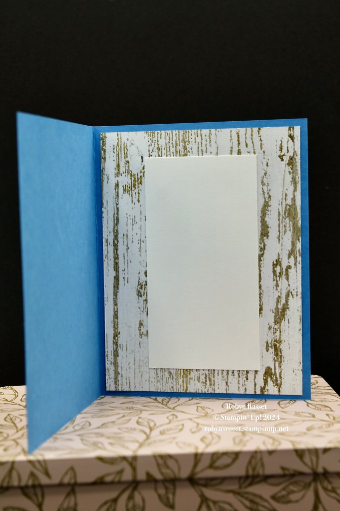 The inside of the card has a second piece of the Country Woods Designer Paper (5 ” x 3 3/4″) with a Basic White (4 3/4″ x 3 1/2″) write on liner. By the way, the DSP on the front is 3″ x 5 1/2″.