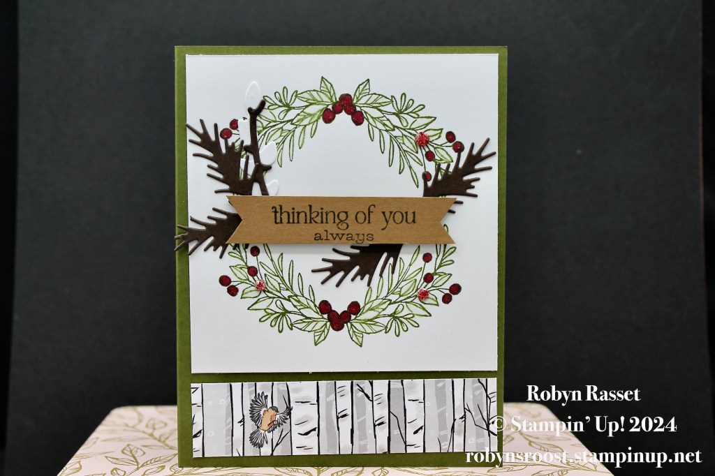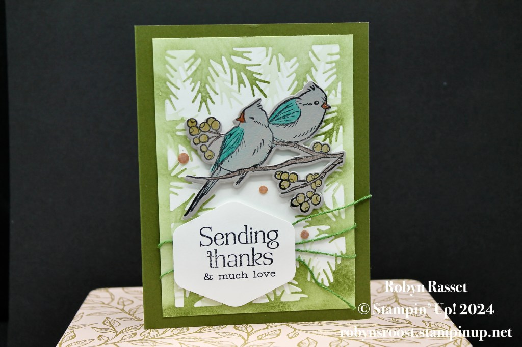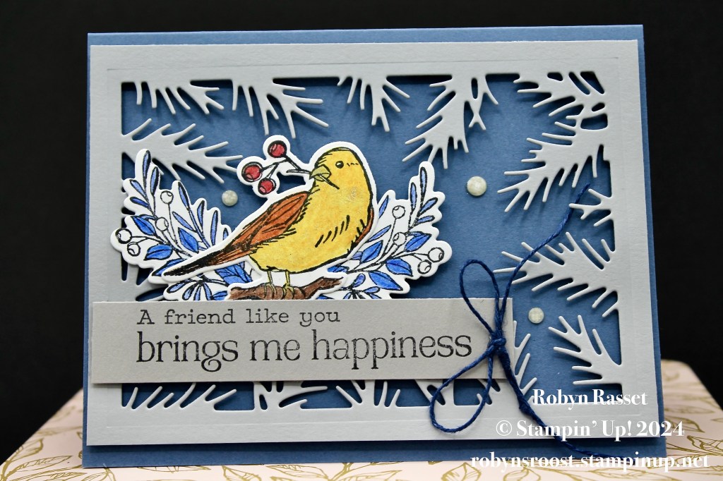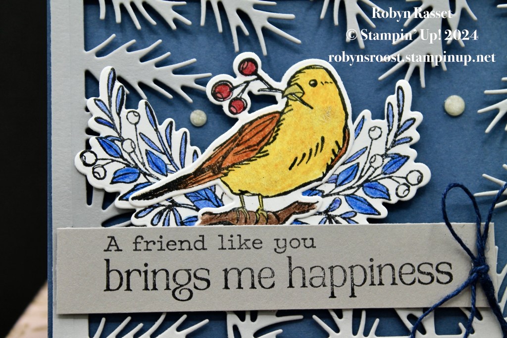The final project was actually a decoration for a box, but I chose to create a card with it instead. The strip on the bottom is from the coordinating Nests of Winter Designer Series Paper. Several of the designs are of beautiful birds which can be fussy cut, or a few even match the dies.