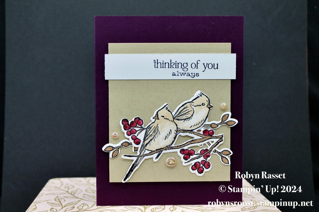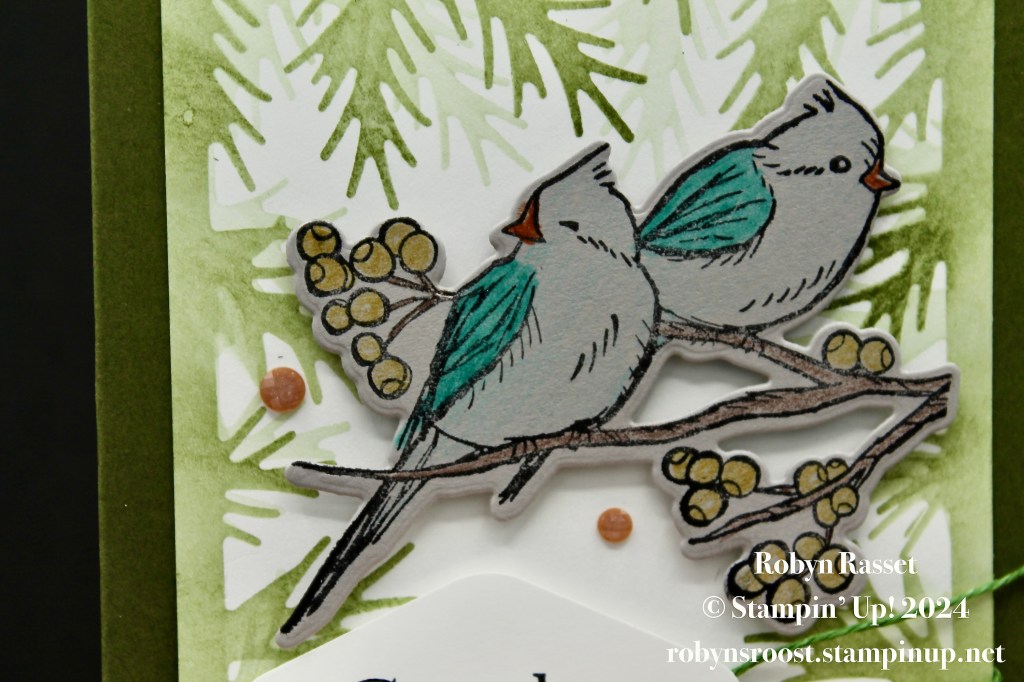 The first card used Stampin’ Blend alcohol markers to color the images AND the pearls. The other cool technique was using the Color Lifter Marker to lighten the feathers on the birds bellies.