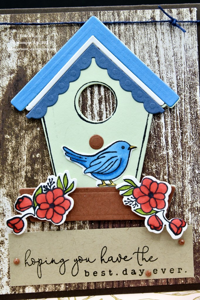 The dies can be used either with the stamps or all on their own to create a cute birdhouse. For this card the birdhouse was stamped first onto a piece of Soft Sea Foam cardstock and then die cut. The three roof pieces are all die cut out Azure Afternoon, Basic White, land Misty Moonlight card stocks. The perch and bottom are Pecan Pie die cuts.