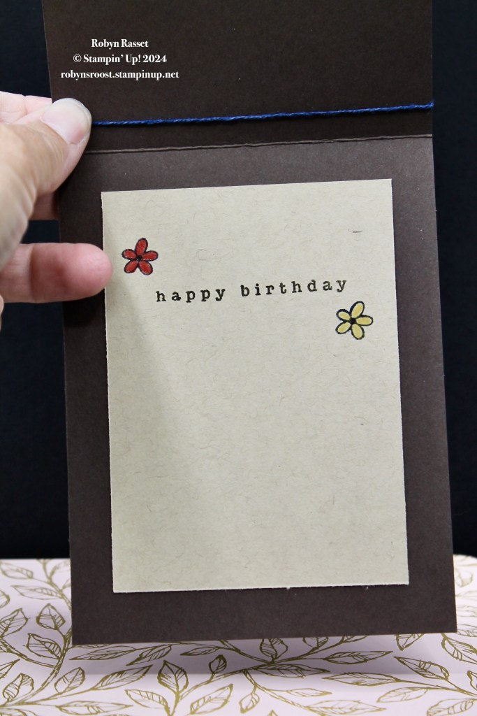 A single wrap of Baker’s Twine is added to the top on this top fold card base (11″ x 4 1/4″ scored at 5 1/2″). The Baker’s Twine is a new item which will be available in a three pack in the upcoming September to December Mini Catalog. Stampin’ Blend Markers were used to color the bird and flowers. I love this greeting! It’s stamped onto a piece of Crumb Cake paper and three Adhesive-Backed Solid Gems add a little sparkle.