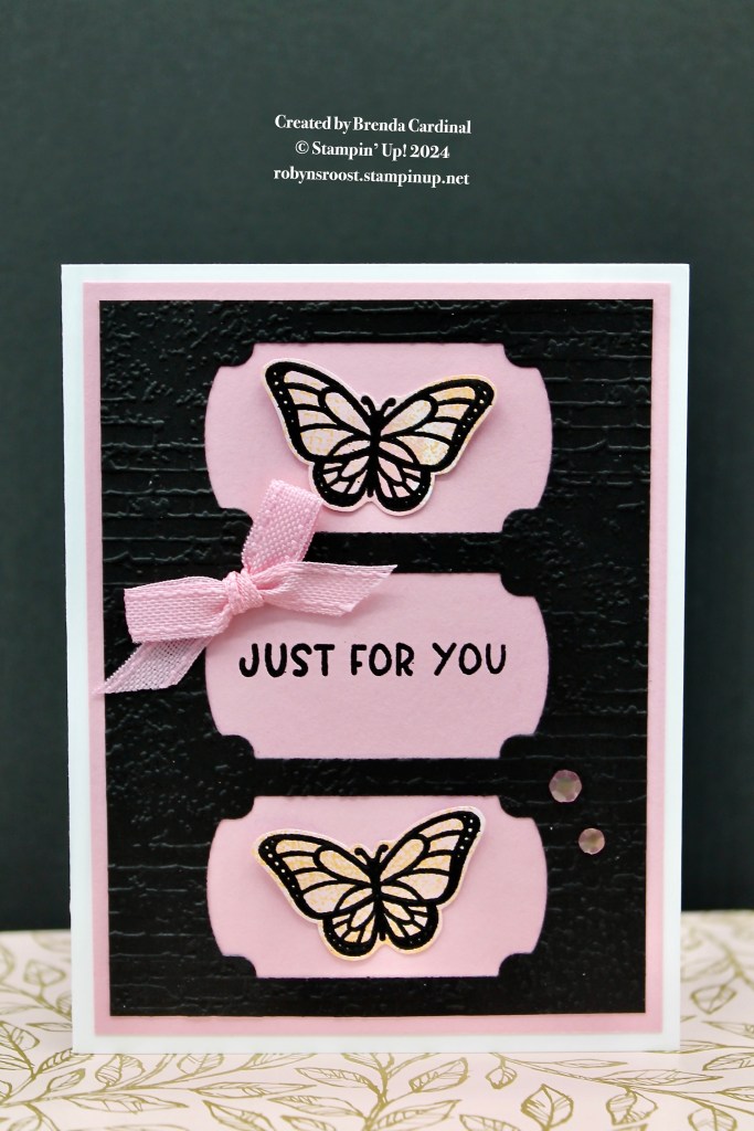 Brenda has used the die for this card. Cutting 3 label images centered in the 3 3/4″ x 5″ Basic Black layer and then embossing it with the Brick Embossing Folder. This is layered onto a Pretty in Pink 4″ x 5 1/4″ layer for a soft feminine look. The pretty pink bow and sequins add to the look.