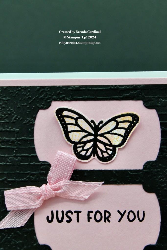 The pretty butterflies and greeting are heat embossed with black embossing powder. The butterflies are stamped onto a piece of designer paper (no coloring needed!).