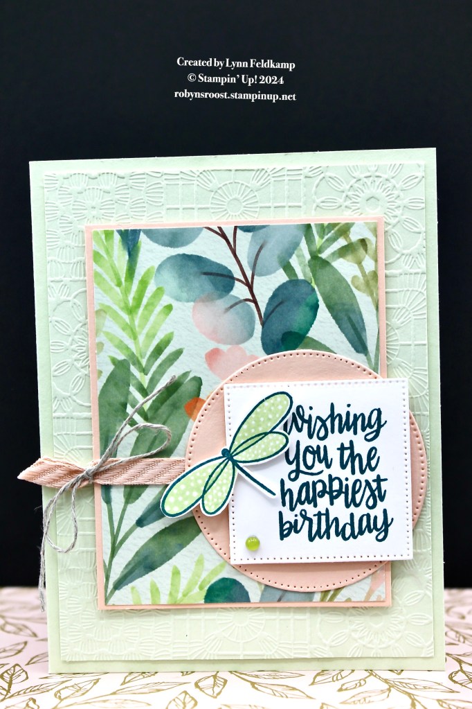 The first card by Lynn Feldkamp uses a piece of the Frames & Flowers Designer Series Paper and the Cute Crocket Embossing Folder. The Soft Sea Foam and Petal Pink colors create a soft summery card.