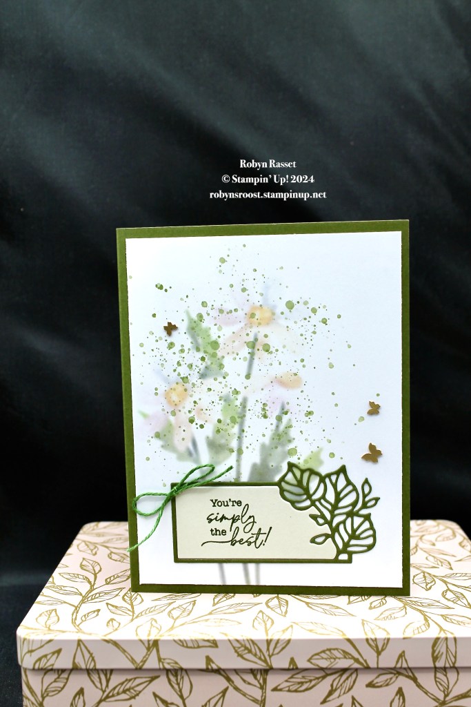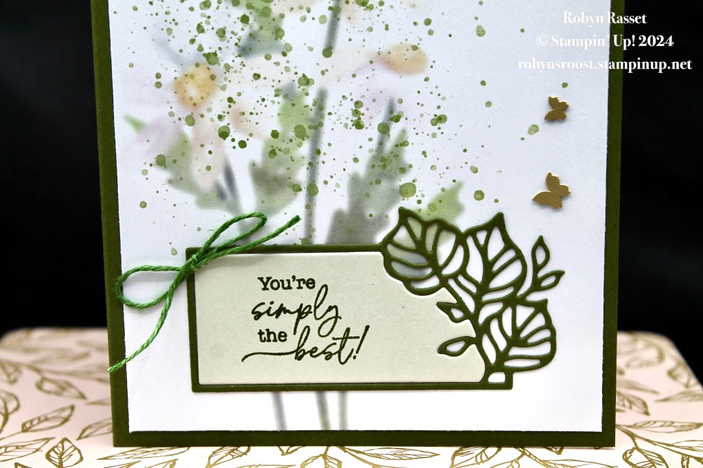 This label die cut is also from the Unbounded Love Dies. I cut two labels, one of Beige and one of Mossy Meadow and combined the two colors. Some Brushed Brass Butterflies and a Baker’s Twine Bow finished off the card front.