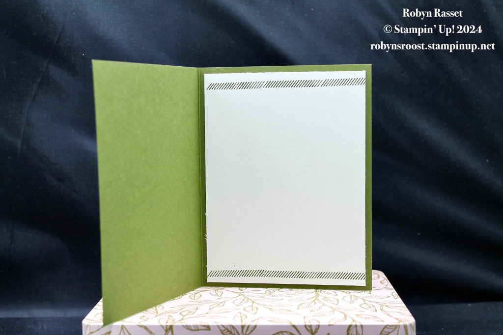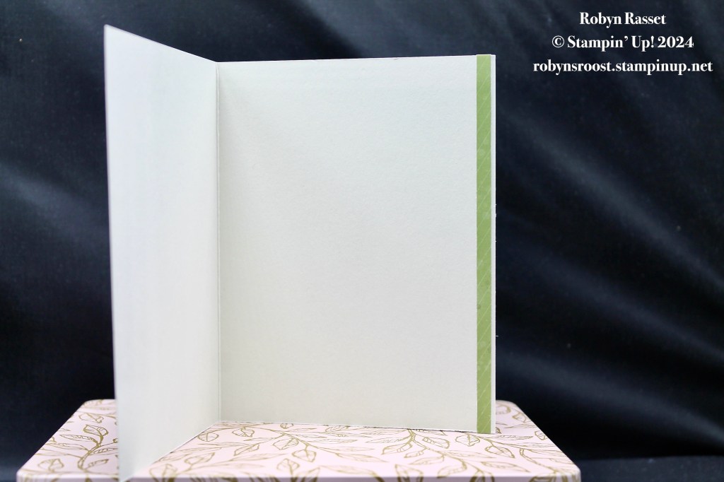 For the inside I experimented with the little lined stamp from the Painted Petals Kit. I had to stamp it three times to go across the white layer. For the first time lining it up I didn’t think it turned out too bad. Photopolymer stamps make it easier to line images up.