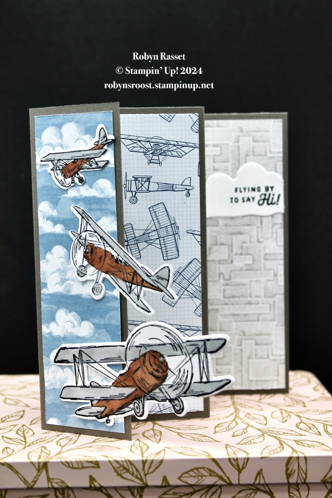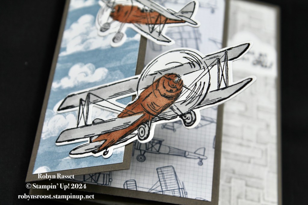 The planes were colored with Stampin’ Blend Markers in Copper Clay and Smoky Slate. Be sure to watch my Take to the Sky Fun Fold Video for tips on placing the planes onto the card.