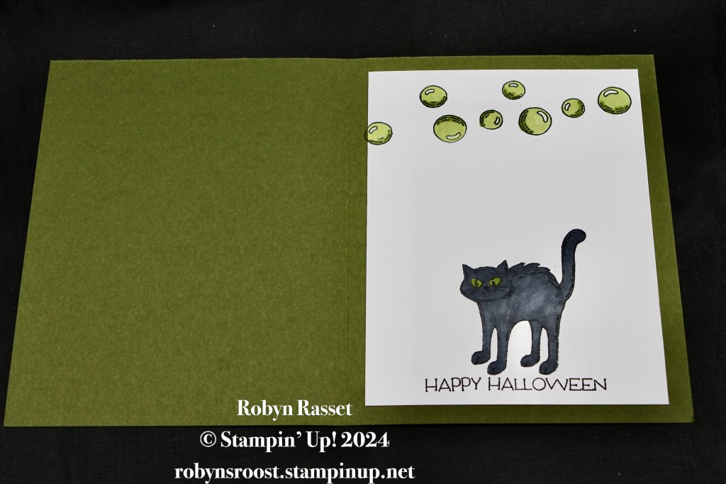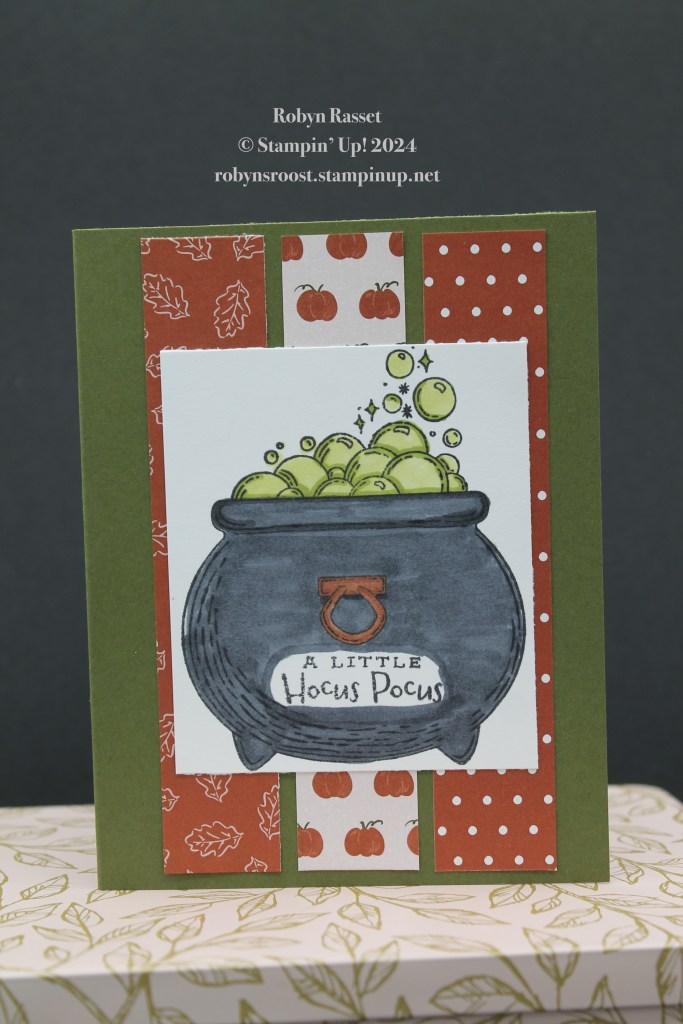 This layout starts with an 8 1/2″ x 5 1/2″ base scored at 4 1/4″. the 3 Iconic Celebration Designer Series Paper strips are 1″ x 5 1/4″ and the witches brew is stamped onto a 3″ x 3 1/2″ piece of Basic White. A mask was added over the greeting and then the pot caldron was colored black with Stampin’ Blend Markers. The bubbling brew is done with Granny Apple Green and some Wink of Stella was added to the bubbles. The handle is done with Copper Clay.