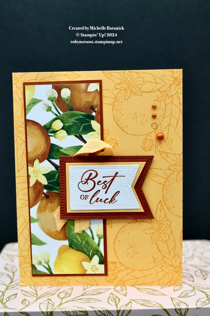 Our next card was created by Michelle Baranick and is another beauty. Michelle has used the stamps from the Citrus Blooms to create a background on the card base and then used a strip of the Mediterranean Blooms DSP for the focal image. Matted with Cajun Craze it really stands out. I love how she has added a hand cut later to the greeting die cuts from the Stylish Shapes Dies. The Peach Pie hand cut matte really takes the card up to the next level. As I was writing this, I realized that I had lost one of the embellishments, so I stopped and added another Iridescent Pearl colored with a Cajun Craze Stampin’ Blend Marker but mine seemed to have less luster than Michelle’s, so I brushed it with Wink of Stella and it’s a match. Again, it’s these little touches that make a handmade card so special.