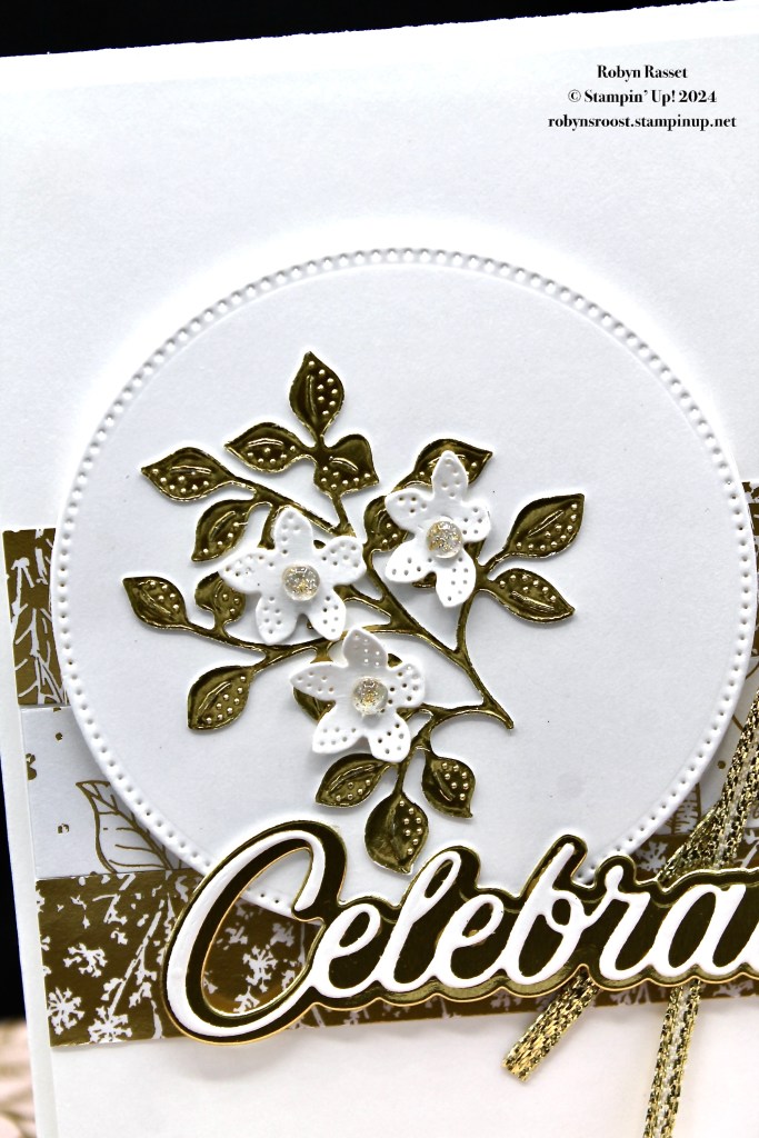 The pretty flower die cuts are from the Stippled Roses Die set and the greeting is from the Wanted to Say Dies. Done with Gold Foil and Basic White paper it’s really stunning.