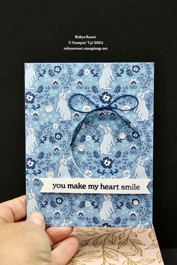 The star of this card is the pretty Countryside Inn Designer Series Paper. (Although, bunnies aren’t my best friends this summer! They keep eating my plants!) This bunny is sure cute. I first adhered a 4 1/4″ x 5 1/2″ piece of the Countryside Inn paper to a Boho Blue card base, using liquid glue. I did make sure to leave the center free of glue so that when I punched the papers I could separate the Countryside Inn paper from the Boho Blue.