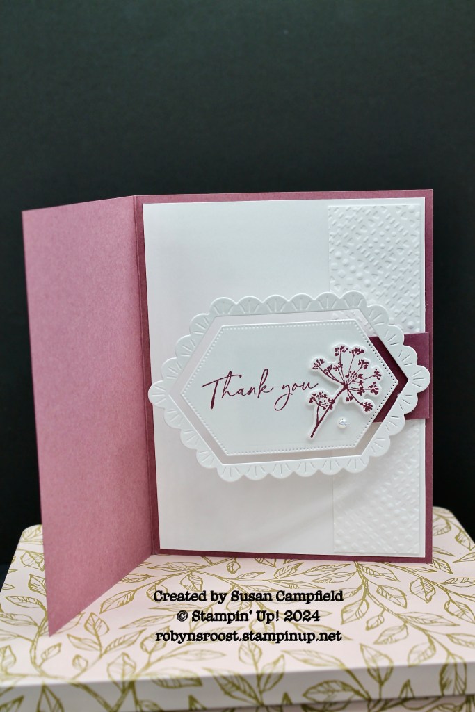 Susan Campfield made a cool Fun Fold with a Buckle Flap in Moody Mauve and white colors. She also incorporated the Dashing Designs 3D Embossing Folder, another item in the Wildly Flowering Suite, into her card.