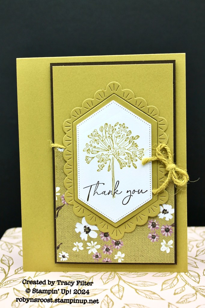 The first card by Tracy Filter uses Wild Wheat colors. Wild Wheat is one of the 2023-2025 In Colors. I just love the label dies in this set with the pretty scallops, starburst lines and stitching! Tracy’s card is a top fold – 11″ x 4 1/4″ scored at 5 1/2″. The entire image layer, starting with the matting has been popped up with dimensionals. The Early Espresso layer is 3 1/8″ x 5 1/8″.