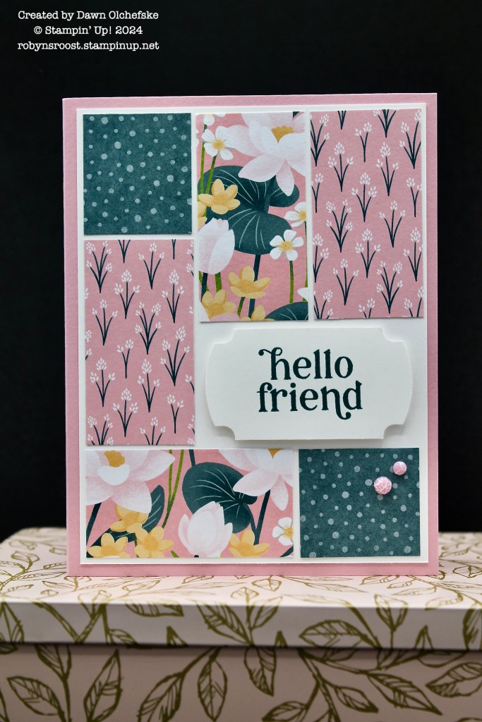 This card uses the Color Blocking Technique with the Lily Pond Lane Designer Series Paper and the greeting is from the Charming Duck Pond stamp set which is part of the suite. Two of the Dapple Dots embellishments, also part of the suite, complete the card.