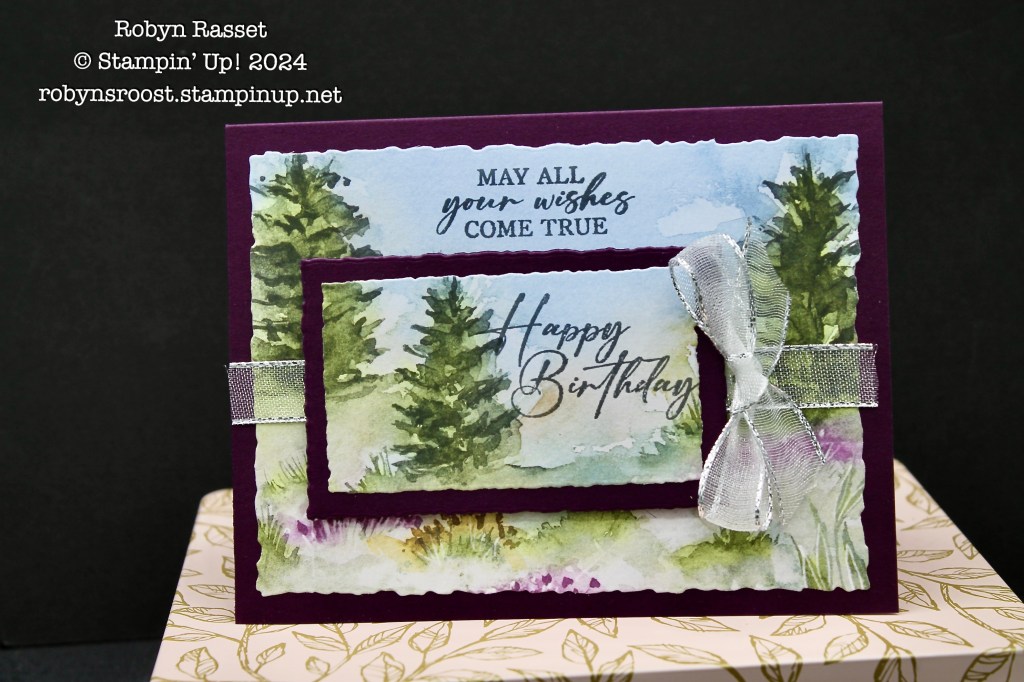 The first card is a birthday card and uses Blackberry Bliss cardstock and the Deckled Rectangle Dies.
