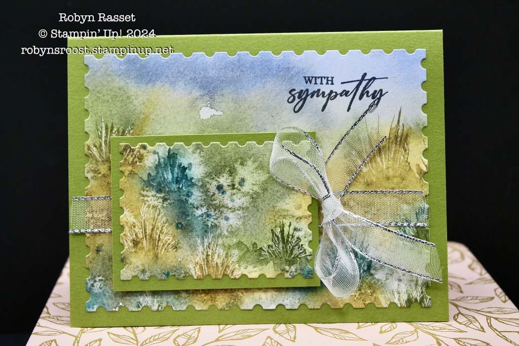 The second card uses Old Olive cardstock and the Perennial Postage Dies. Both cards have greetings from the Unbounded Love stamp set and a pretty Silver & White Ribbon. The bow is done separately and attached with a Glue Dot. The strip of ribbon is attached with Stampin’ Seal Adhesive and is only 5 1/4″ long. The center die cuts are popped up with dimensionals.