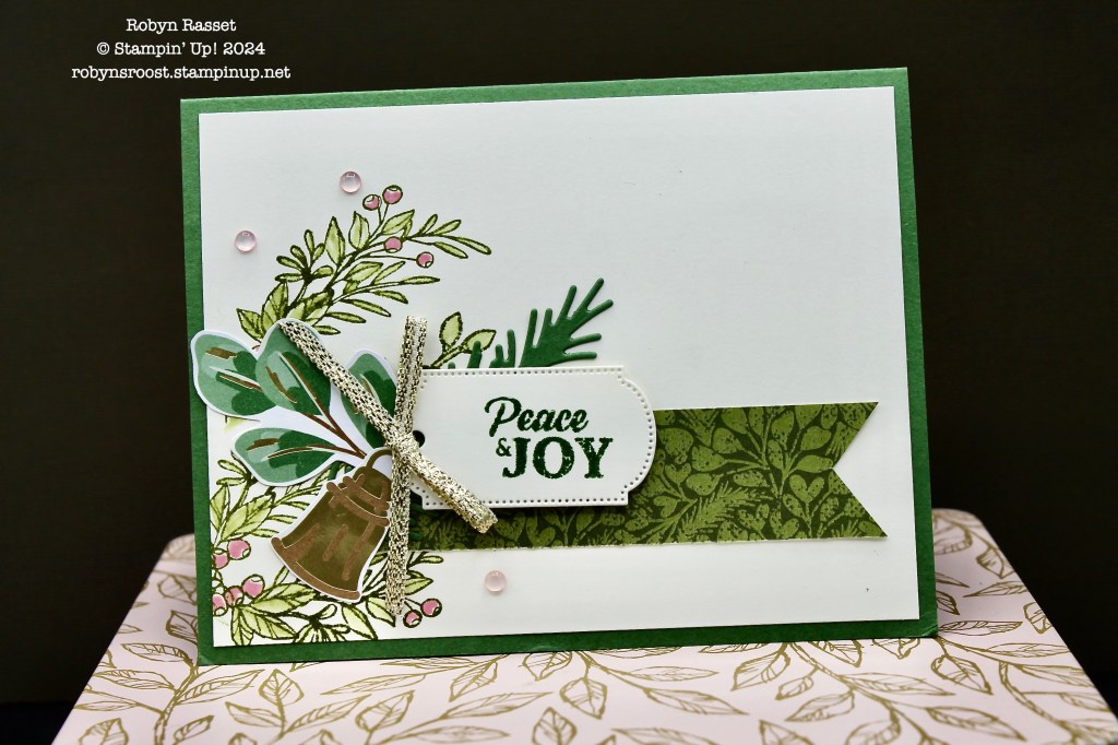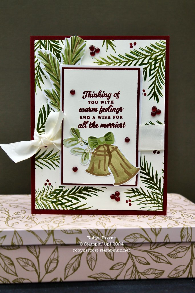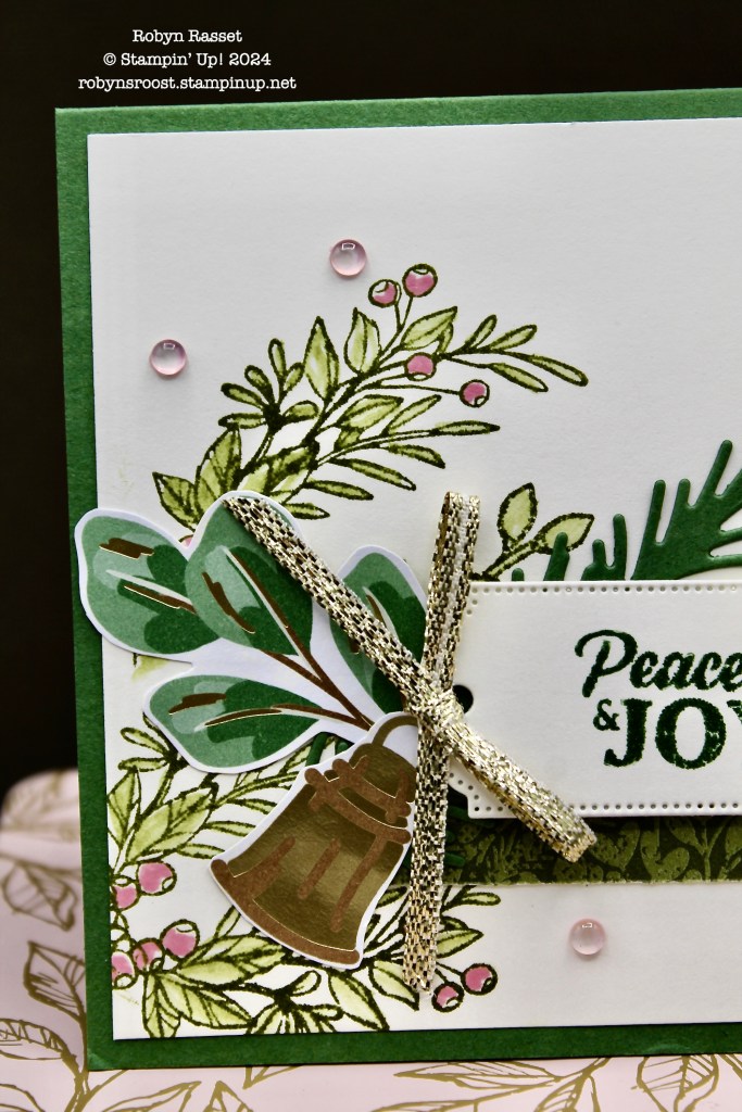 The first card was actually the trickiest, because it had lots of stamping, using the stamp sets that I didn’t have. I pulled out the retired Christmas Pines set for the pine boughs. The greeting used on the directions was much longer than the one that I used from the Peaceful Season (coming in the new Mini Item 164145) stamp set, so I fussy cut some images (bells & greens) from the gorgeous gold foiled Seasons of Green & Gold Specialty Designer Series Paper. The kit even contained some of the Cherry Cobbler & Pearl Embellishments so I added 3 of each type, the triple berries and the singles ones, onto this card.