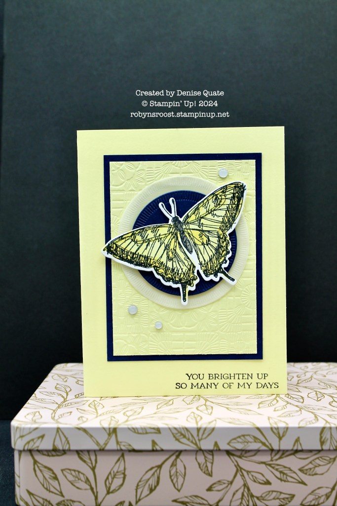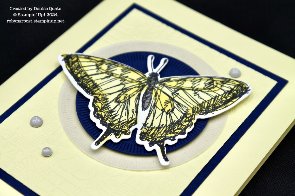Today I have a pretty butterfly card done in Night of Navy and Lemon Lolly colors created by Denise Quate.