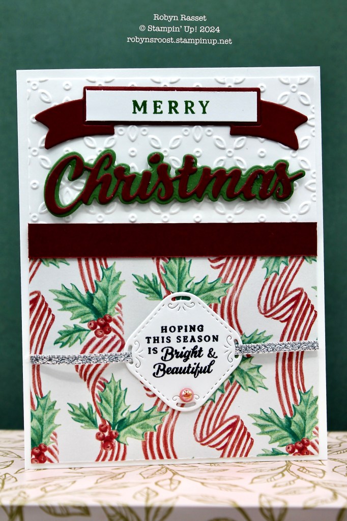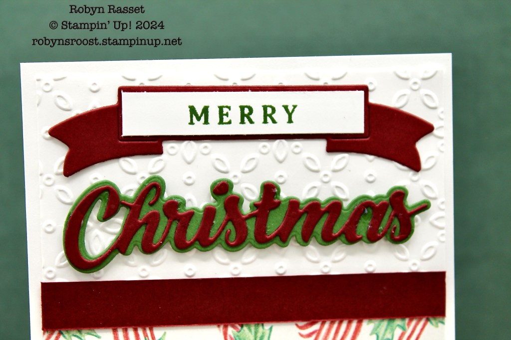 I absolutely love the two dies that created the shadowed word, Christmas! The banner is pretty sweet too! I’ve used the Eyelet 3D Embossing Folder to add a lacy texture to the background layer.
