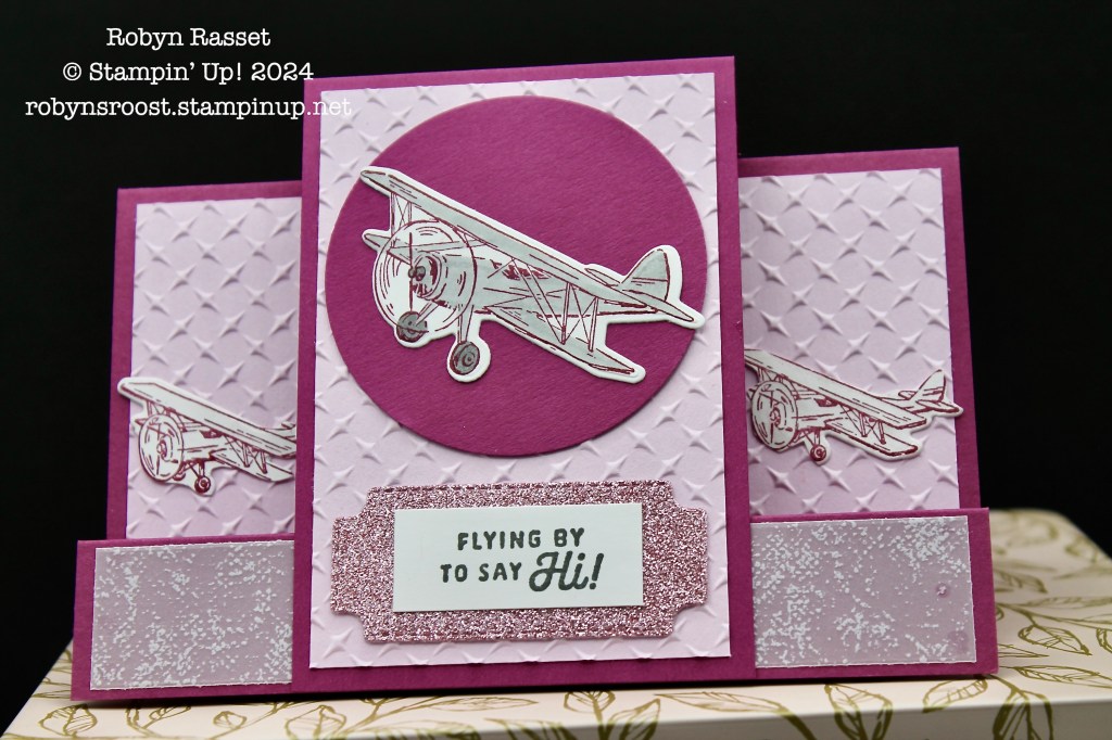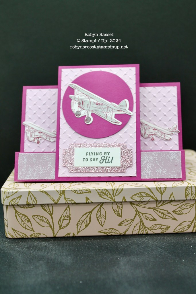 I love the pink and gray color theme! I do know a few women aviators and one in particular who this card would fit to a T! It uses the Adventurous Sky Bundle, which I love, but I have been making my cards in blues. grays, and greens, this pink is stunning. It’s been created as a faux step card. I love the Metal Plate Embossing which gives it an industrial look, even though it’s done in pink.
