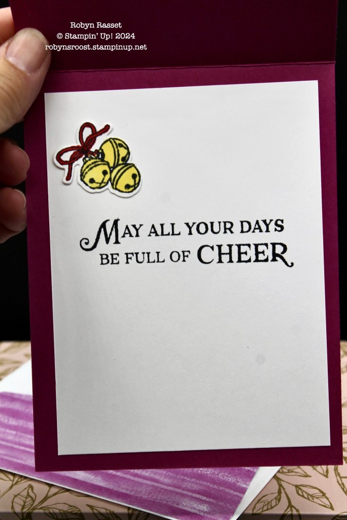 I did manage to get another die cut on the inside. The bells are colored with Stampin’ Blend Markers and then die cut. I love the nice big greeting for the inside.