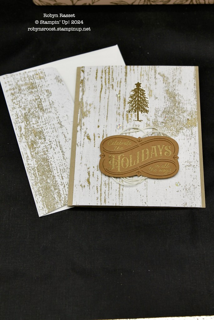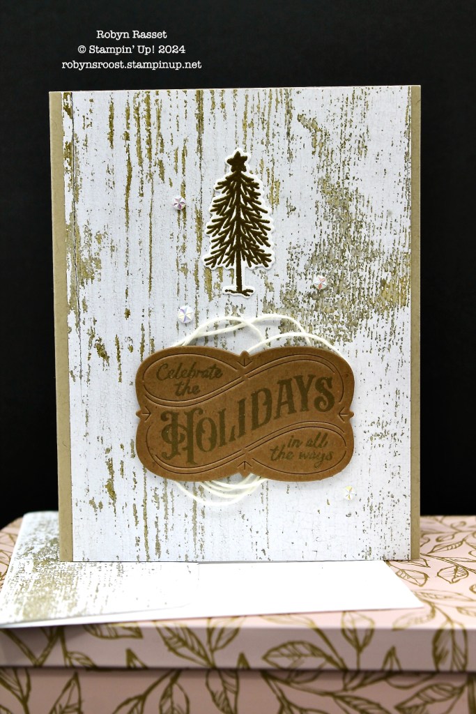 The little tree is embossed with the gold embossing powder and adhered with Stampin’ Seal. Four of the Iridescent Faceted Gems were added.