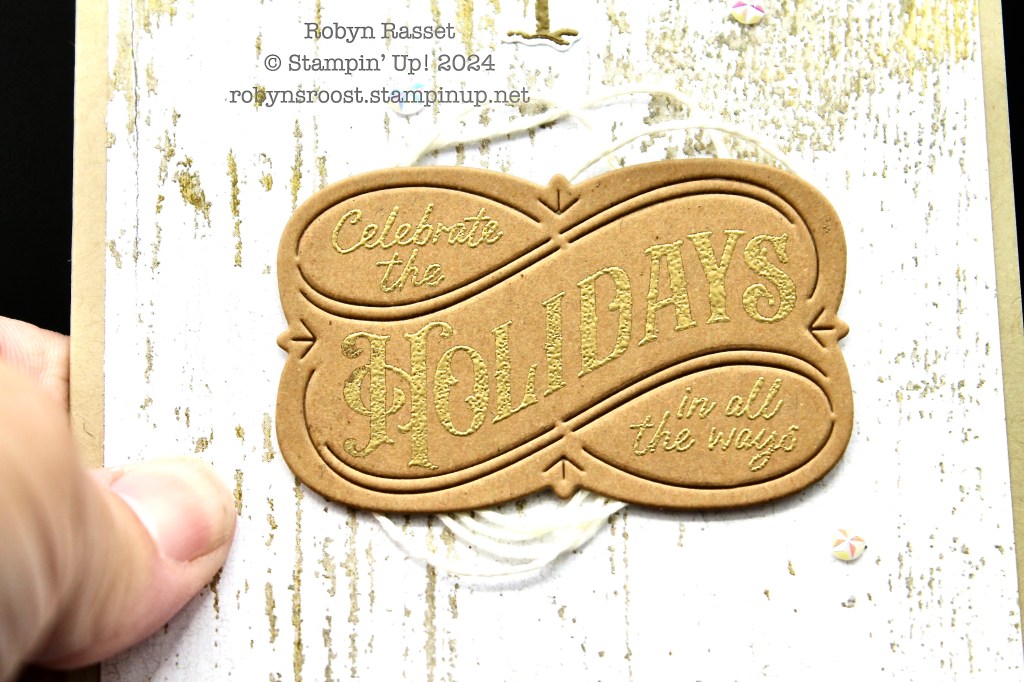 The greeting label is die cut with the Christmas Labels Dies from a piece of Pecan Pie paper. Next it is stamped with a greeting stamp from the Christmas Labels stamp set, with VersaMark ink, and finally heat embossed with Gold Embossing Powder. White Baker’s Twine was wrapped around my fingers and then pushed into tape runner that was applied to the back of the label. It was added to the card with dimensionals.