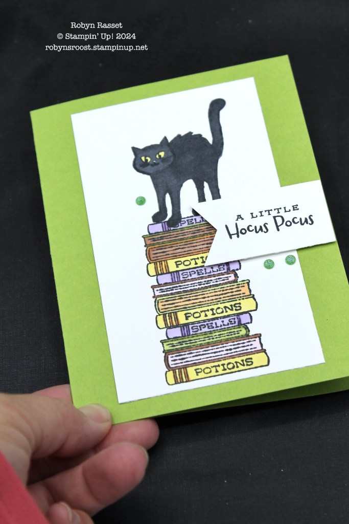 The image is colored with Stampin’ Blend Markers and some Earth Tone Shimmer Gems are added for a little sparkle. The Potions & Spells stamp set does have a coordinating die set (Potions & Spells Dies) but they were not used on this card.